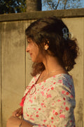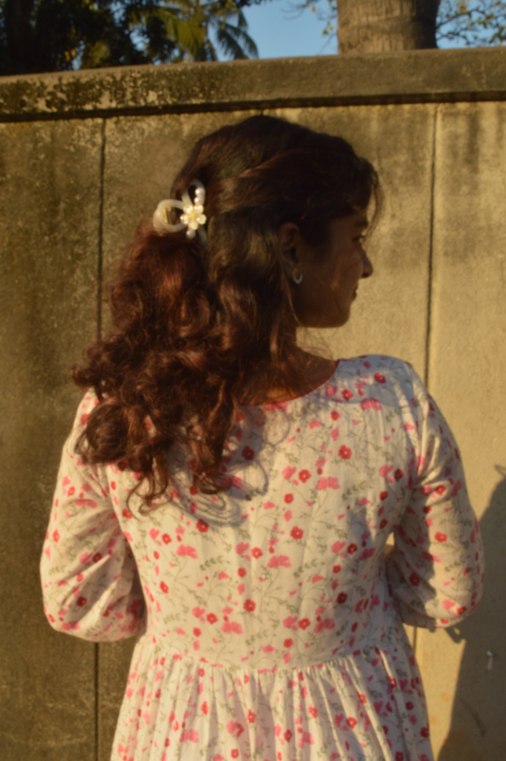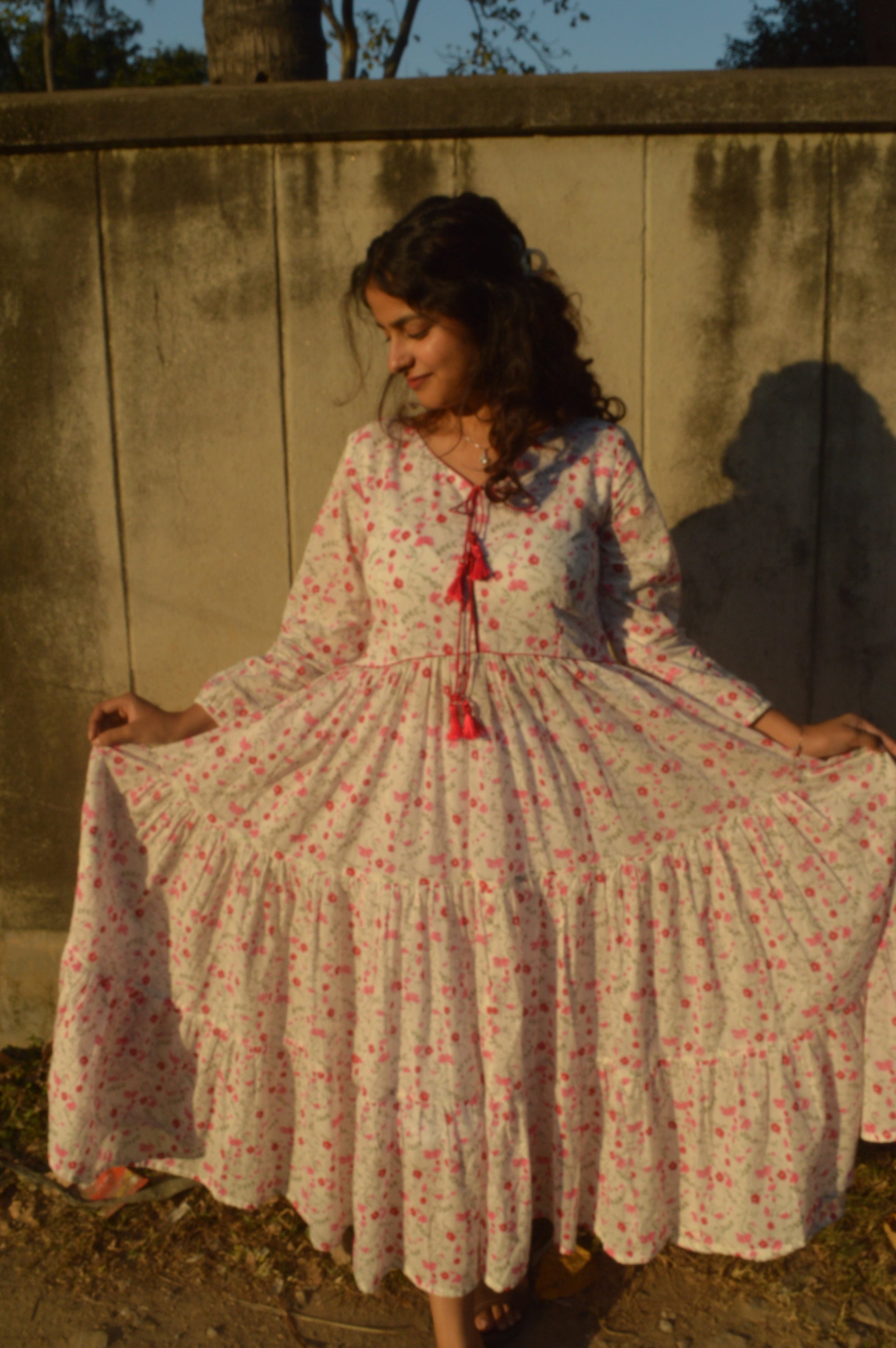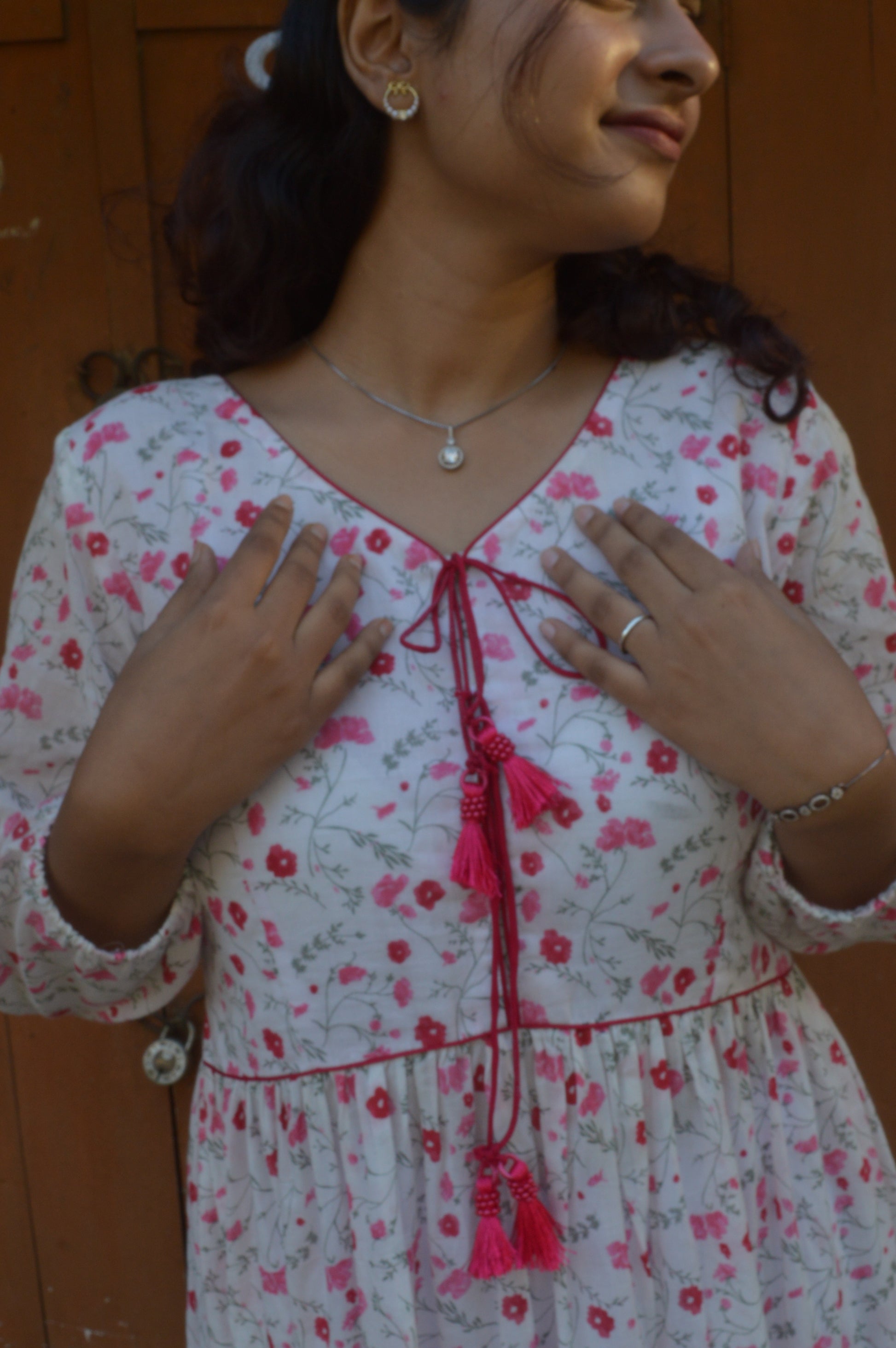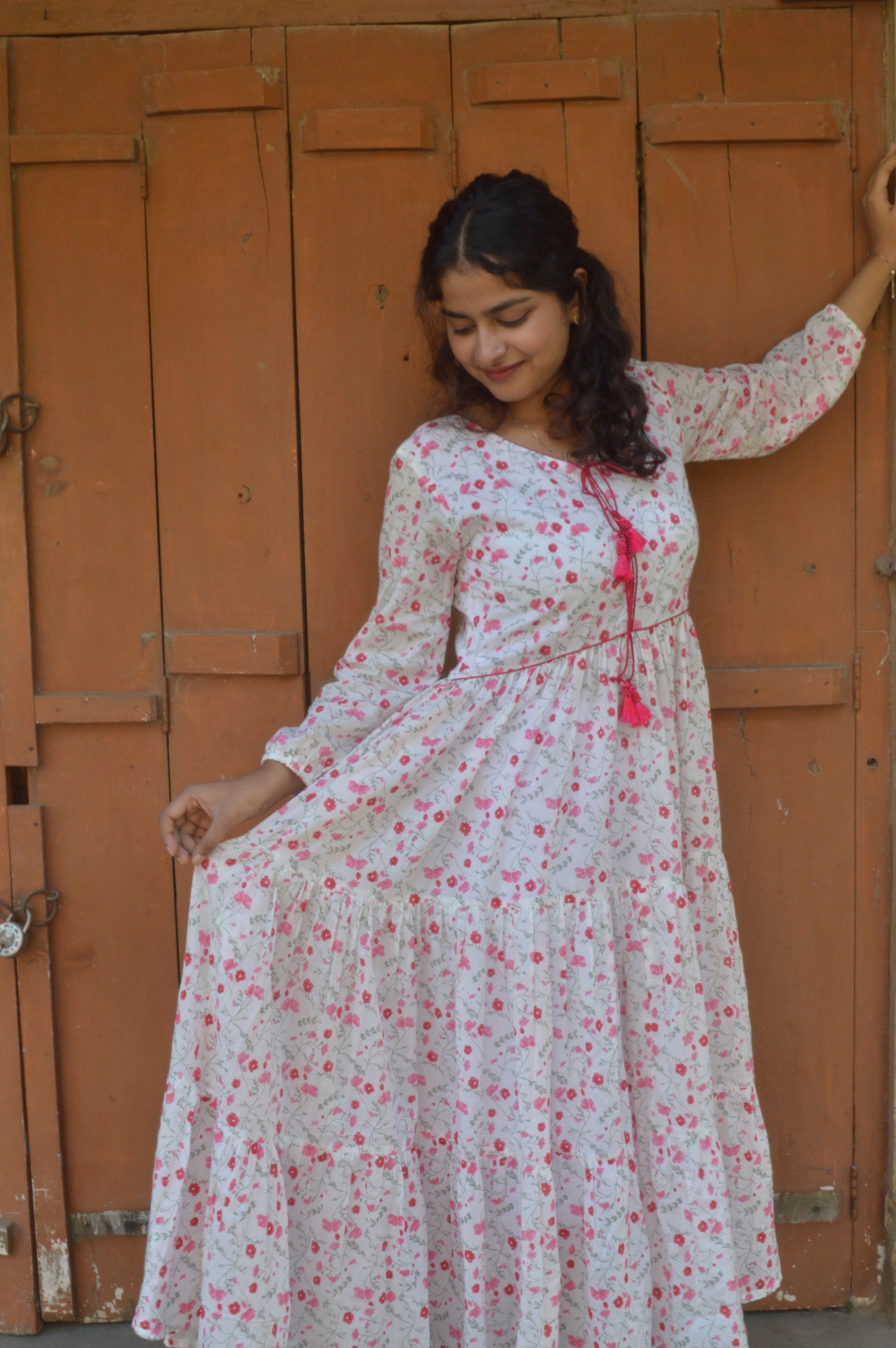 A charming pure cotton maxi dress featuring delicate pink floral prints on an off-white base. Designed with a V-neckline, front tie-up tassels, and three-quarter sleeves, this flowy dress brings effortless grace and comfort. Perfect for casual days, brunches, or summer outings — soft, breathable, and stylish all in one! 💕