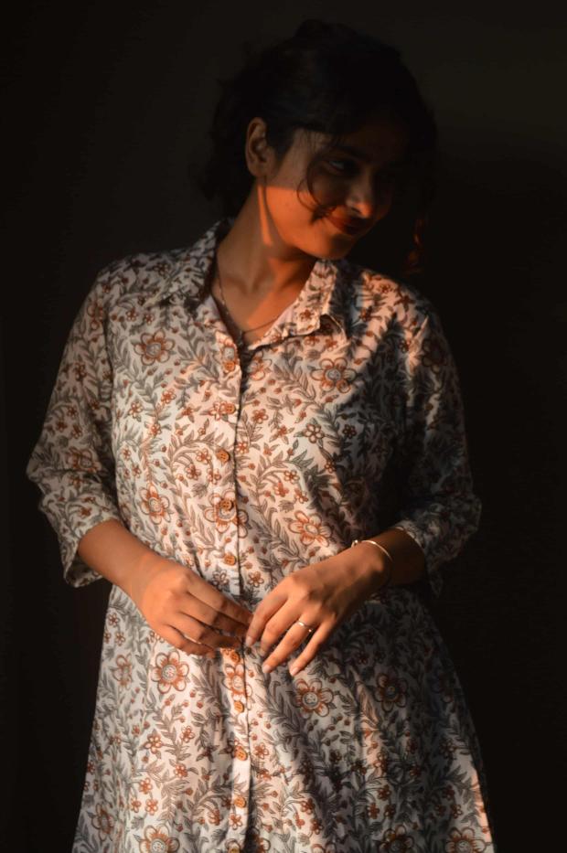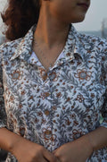 This stylish pure cotton co-ord set features a shirt-style kurti with a soft off-white base adorned with elegant brown and grey floral-leaf prints. The top comes with a collared neckline, half sleeves, and button-down front, giving it a smart and comfy look.
