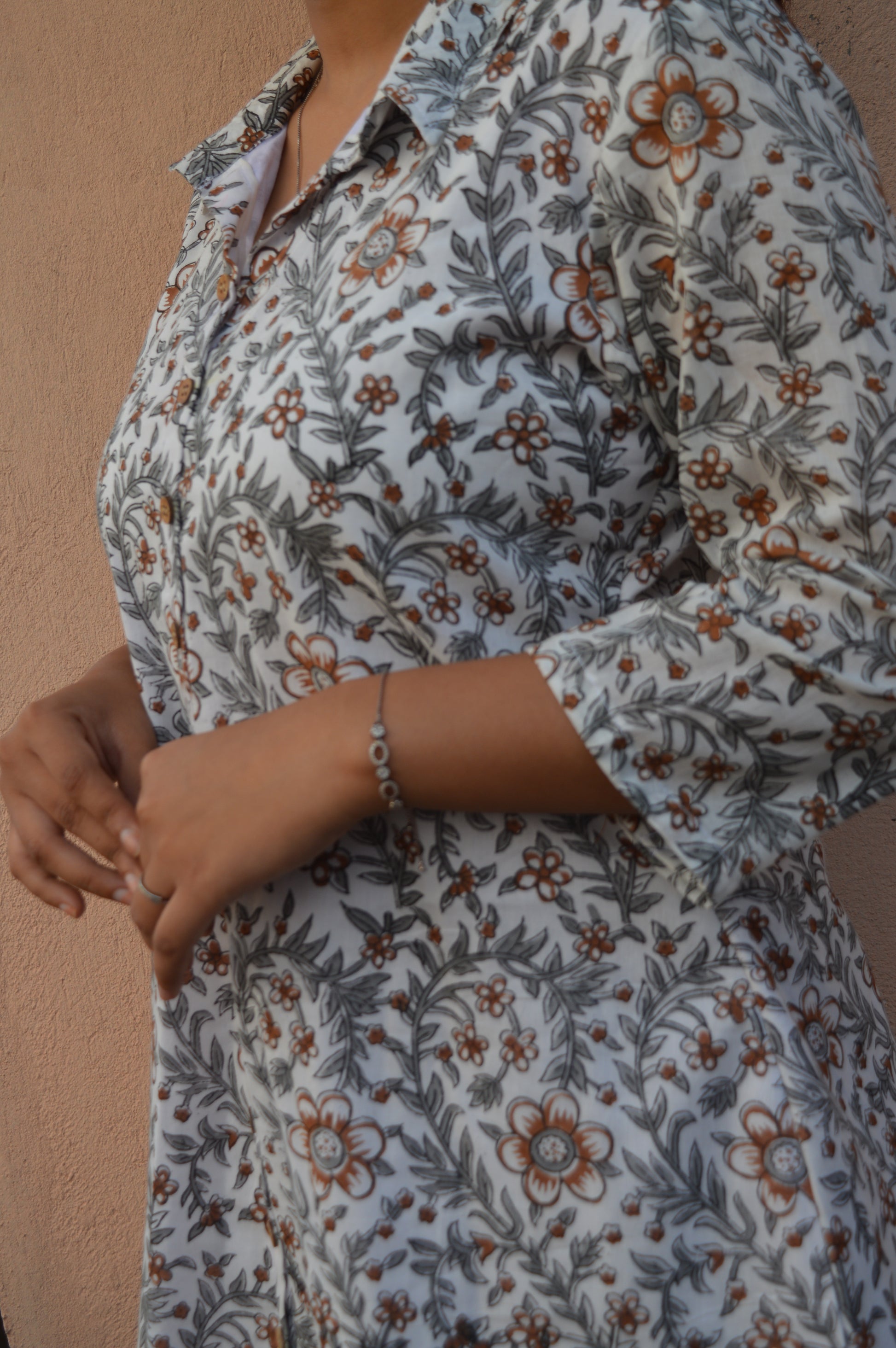 Colour: Off-white base with Brown & Grey Leaf-Floral Print