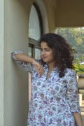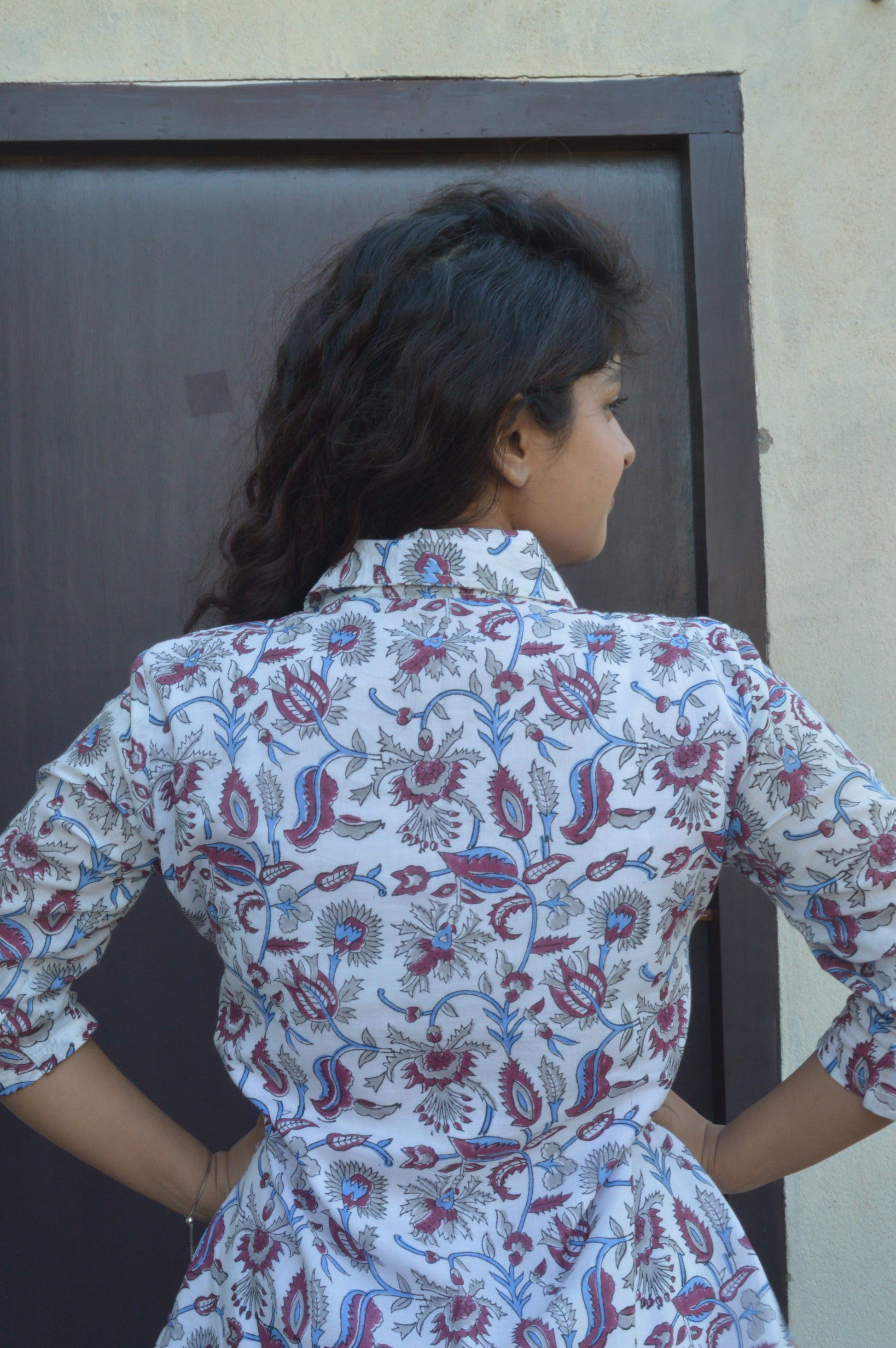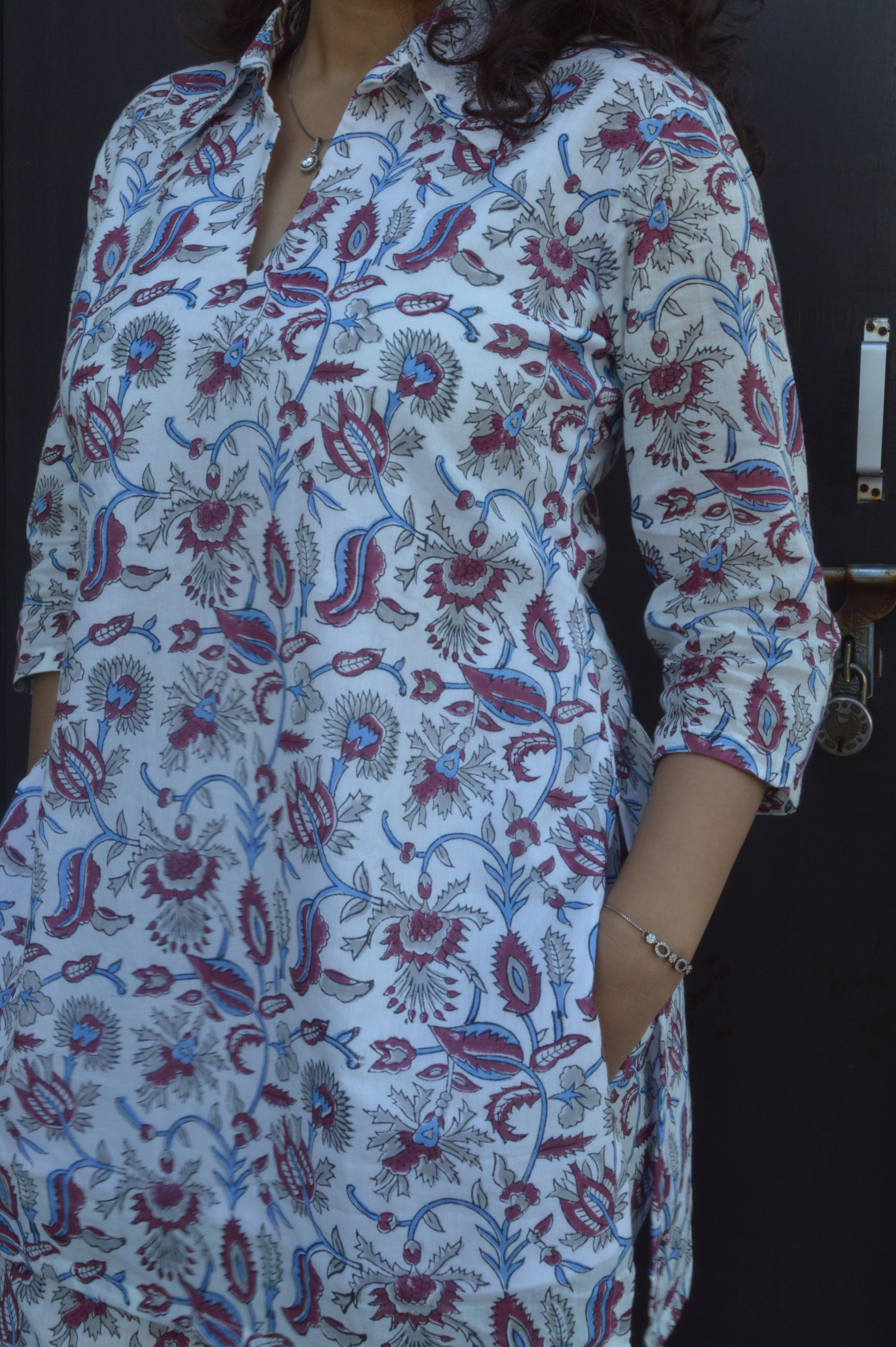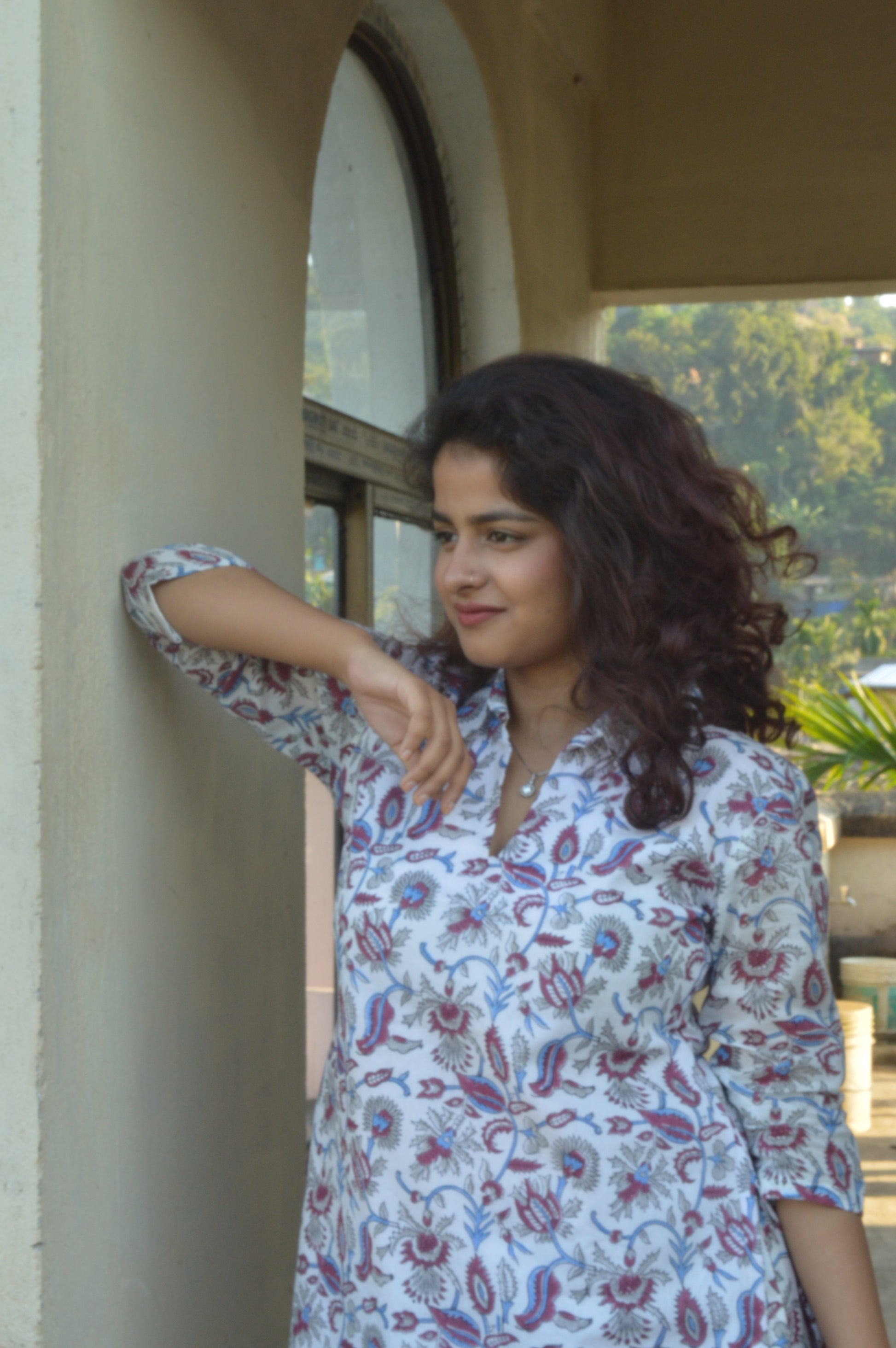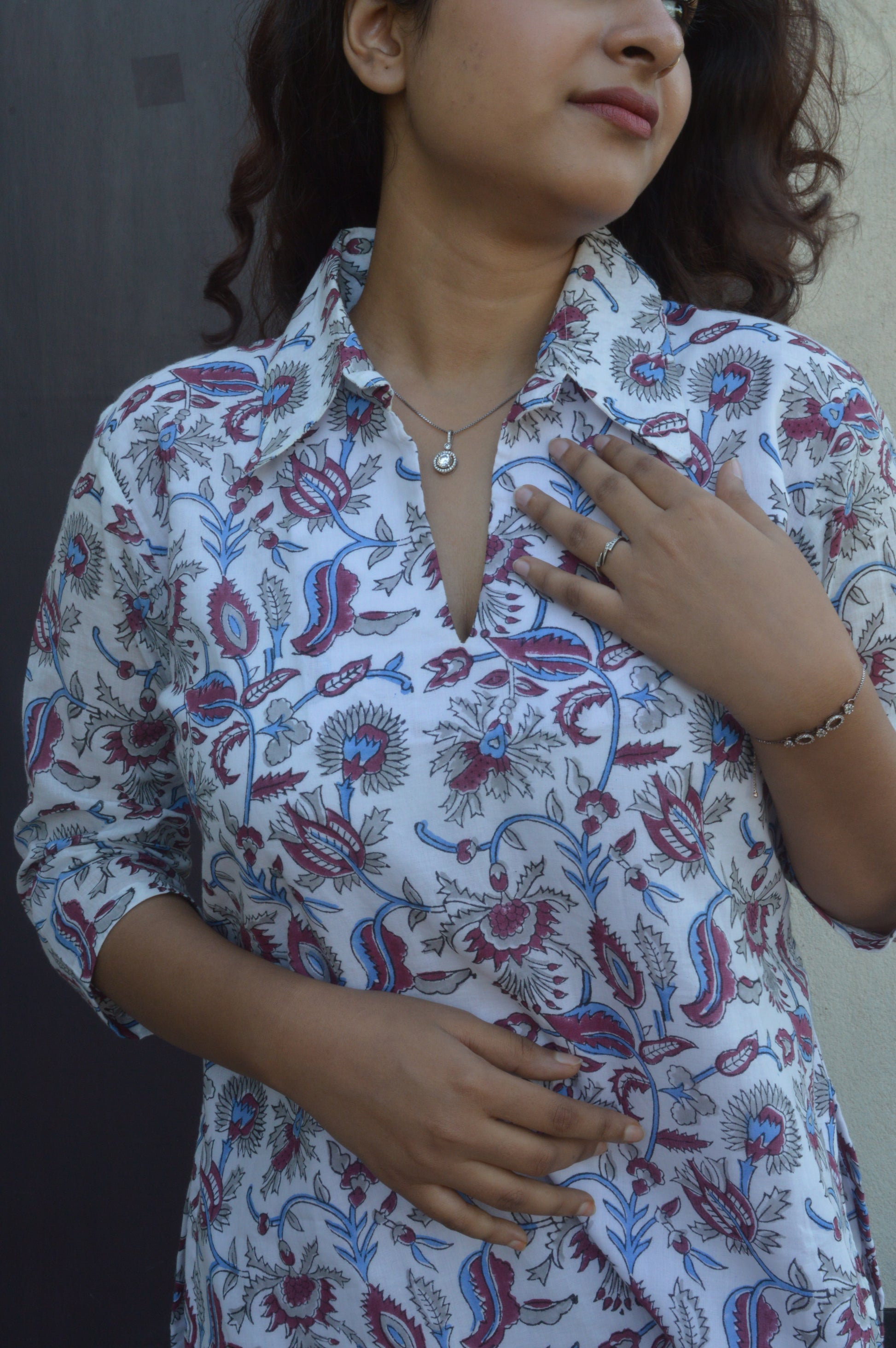 The vibrant red and blue floral prints on a soft off-white base bring a refreshing touch of tradition blended with modern simplicity. Paired with matching straight-fit cotton pants, this set is perfect for casual outings, office days, or travel.